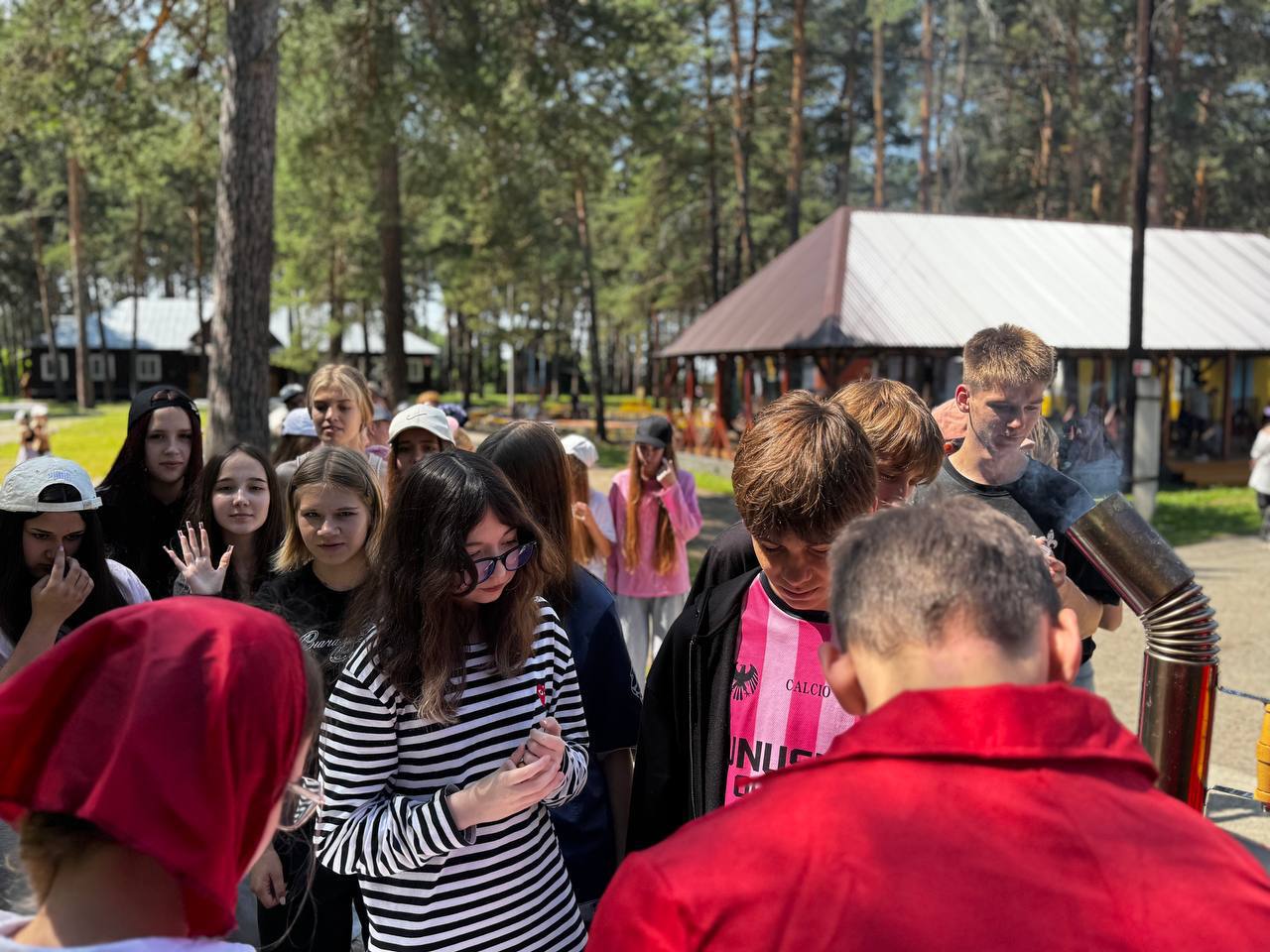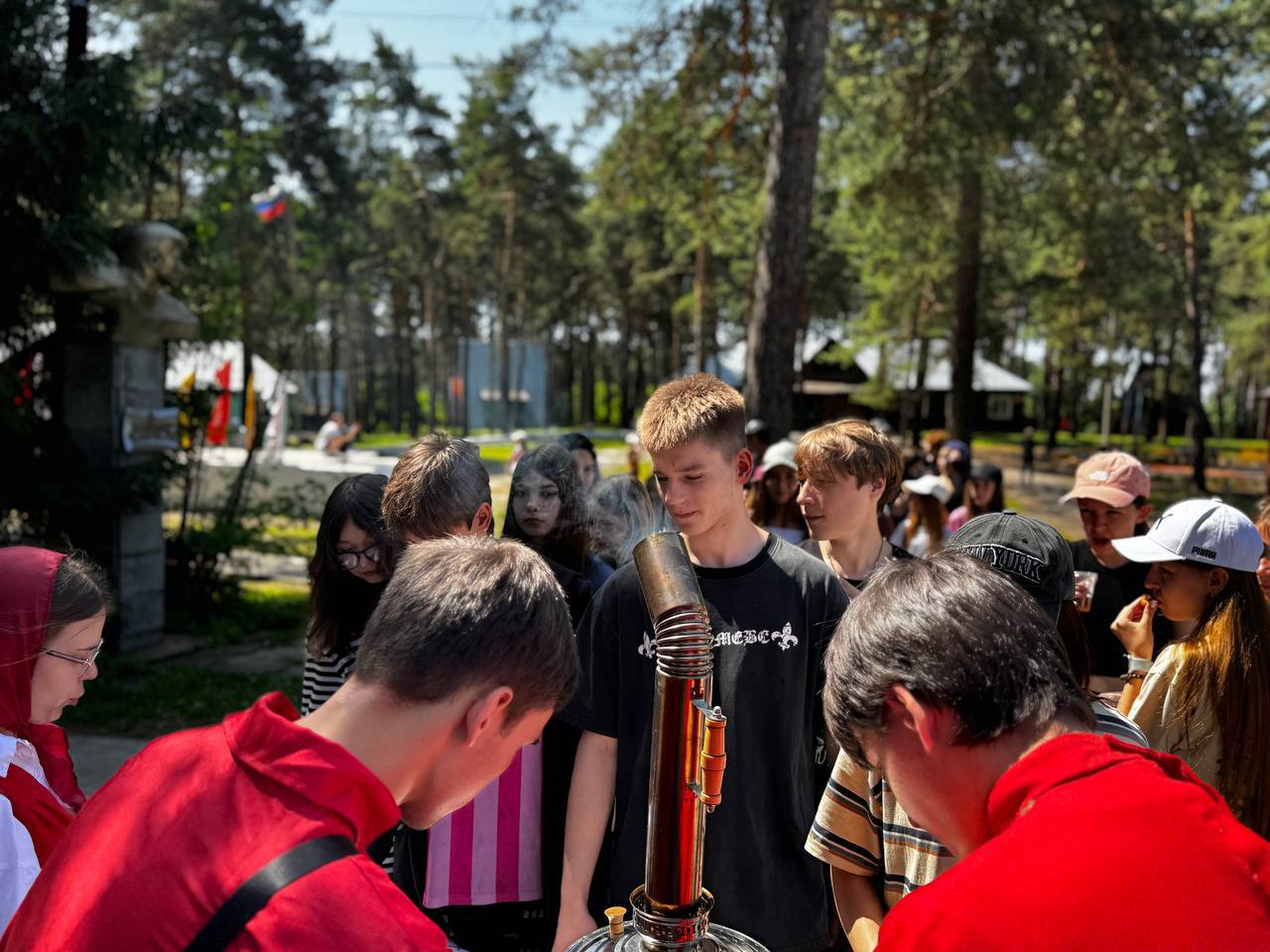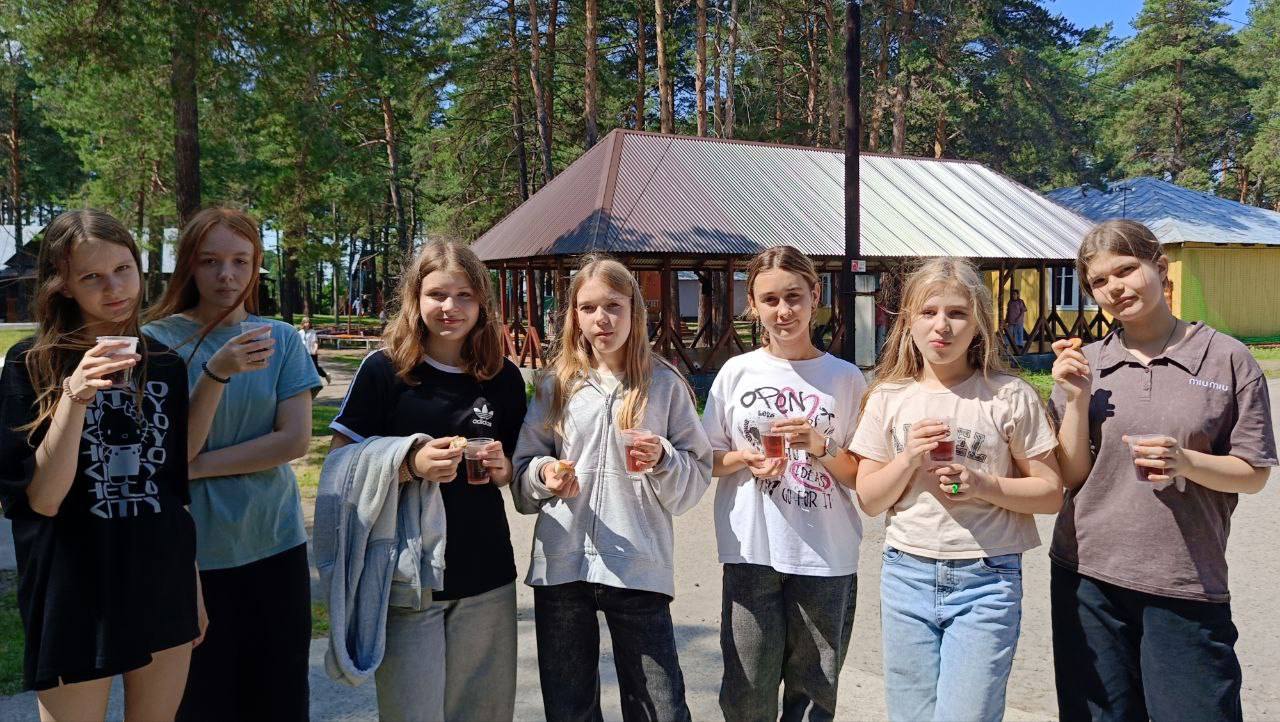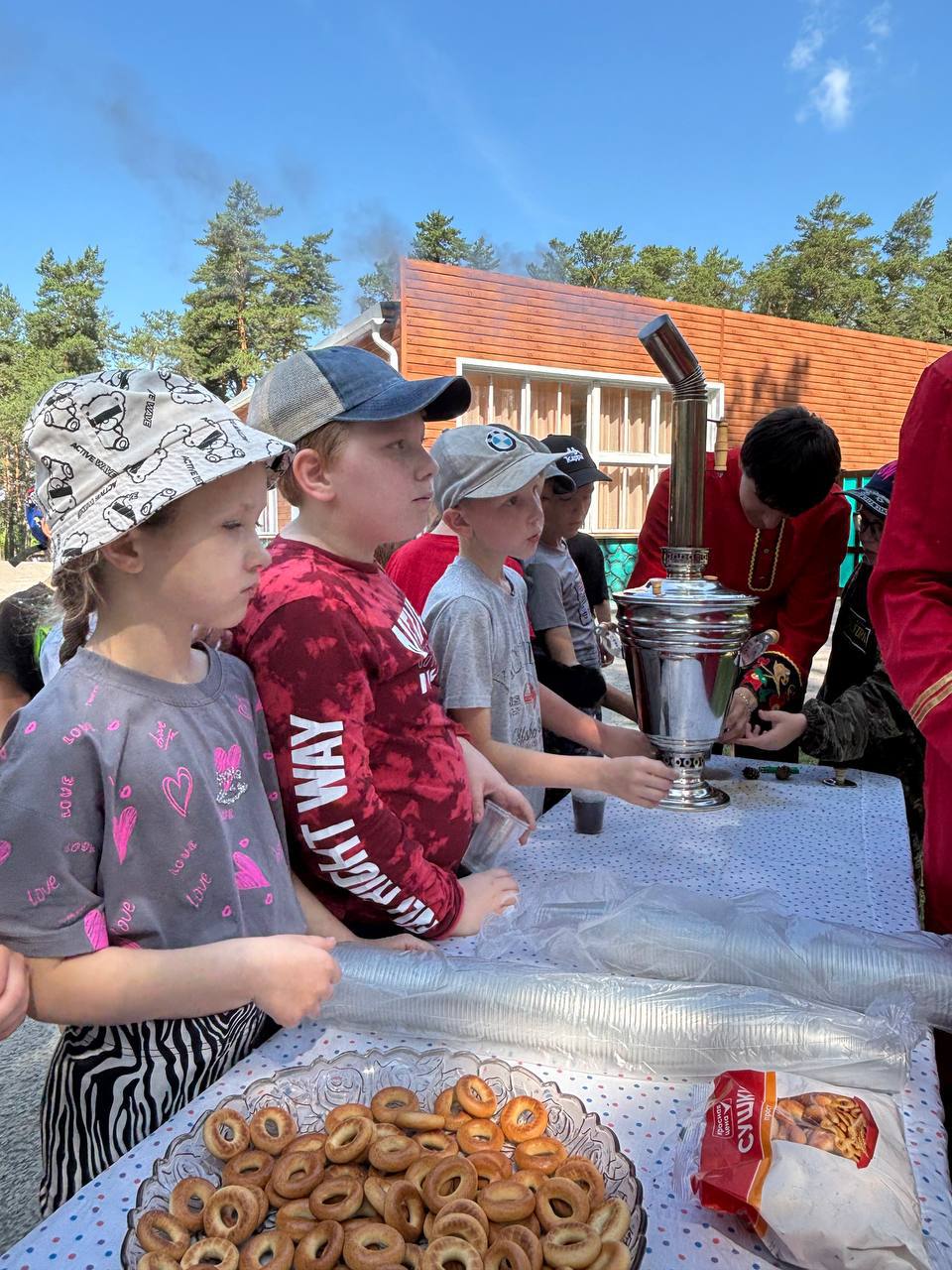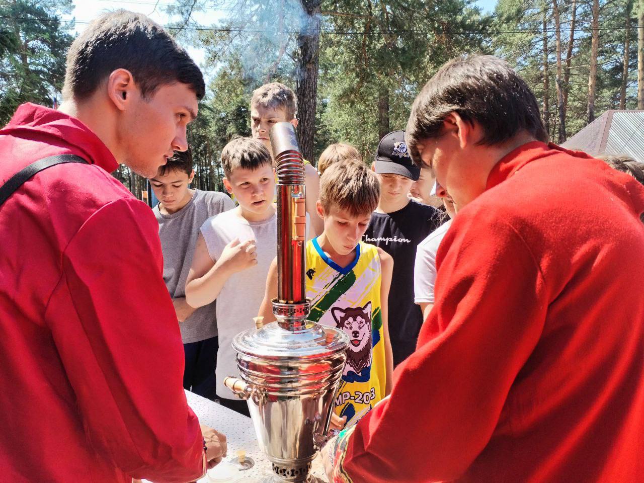 Сегодня в честь дня России в нашем лагере проходило традиционное, ежегодное чаепитие, ребята пили чай приготовленный в самоваре, а также угощались сушками и баранками!